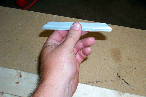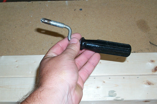 Once the holes are drilled, they must be deburred before riveting. When a hole is drilled in metal it leaves a little burr of metal around the hole. If these burrs are not removed, the rivet cannot sit flat down on the metal when it is set and this will result in a weaker joint. It may also result in future cracks around the hole. To deburr the holes, a deburr tool (pictured below) was used: