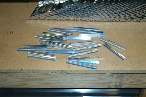 The 4' strips were then taken over to my friend Mickey's house and were bent into 90 degree angles using his large brake. Just like everything else, we made sure there was a radius in the corner. These 4' angles were then cut to size using tin snips and their edges were smoothed on the scotchbright wheel. Here is a bunch of stiffeners for the nose ribs: