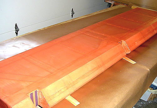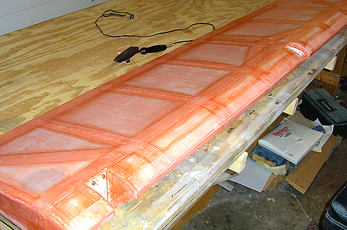 I used 2" wide tape over the ribs and transition from hard to soft areas. I used 3" bi-directional tape on the ends and in the hinge pockets because it readily forms around a corner. Finally, I used 4" tape along the trailing edge and along the leading edge.