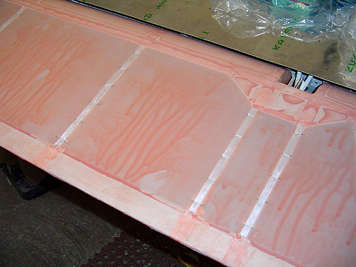 Once, everything was smoothed out, a couple of cross coats (one north/south and one east/west) of the pink poly brush was sprayed on, putting it on very wet to fill the weave of the fabric. Here is the flap after the cross coats of poly brush: